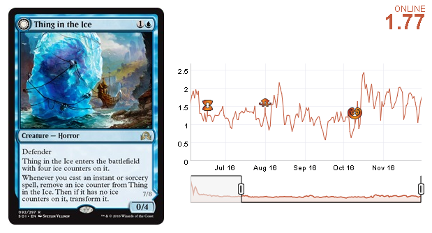 Thing in the Ice // Awoken Horror is one of the most volatile cards in standard. These cards offer great profits but they are also very risky. Pro Tour Kaladesh proved the card can be played in the Standard. It is even played in Modern. I think now is a good time to sell any copies you have, then track its movements to rebuy when it drops to 1 tix, providing a 50 percent profit or so.