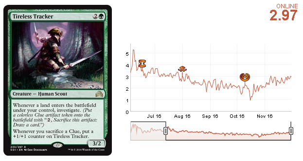 I have been tracking Tireless Tracker's price movements very closely, and I haven't decided to sell my copies yet. This weekend will be the determining factor, so I will pay attention to the dominance of BG Delirium and RG Aetherworks Marvel (which usually plays four copies of Tracker in the sideboard) – and, of course, whether a new deck appears. If BG or RG don't have outstanding performances in this weekend's tournaments, I will finally liquidate my copies of Tracker.