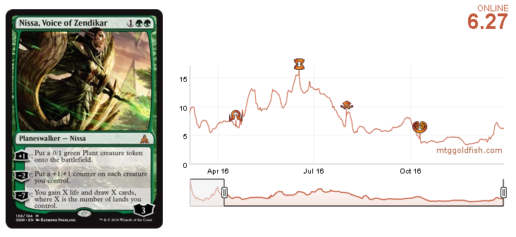 Nissa fell to 5.5 tix after the WG Tokens deck hype ceased, called for a time the strongest deck in that season. Those situations are great, because when a deck is heavily played and those players decide to sell it all at once, the market will be flooded and underpriced waiting for a rebound to happen. Nissa started to go up before Kaladesh, but after that set was fully spoiled, its price crashed again, maybe because there weren't any apparently good cards to brew with. All that season, the card remain silent –until a few weeks ago, where great green and white cards from Aether Revolt to combine with Nissa were spoiled and the card spiked in response.