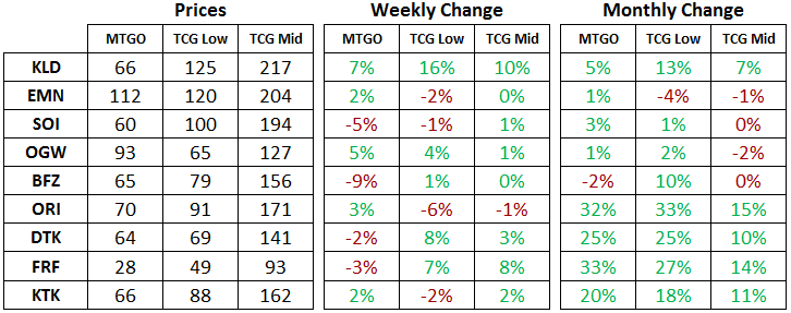 All MTGO set prices this week are taken from GoatBot's website, and all weekly changes are now calculated relative to GoatBot's "full set" prices from the previous week. All monthly changes are also relative to the previous month's prices, taken from GoatBot's website at that time. Occasionally, full set prices are not available, and so estimated set prices are used instead.