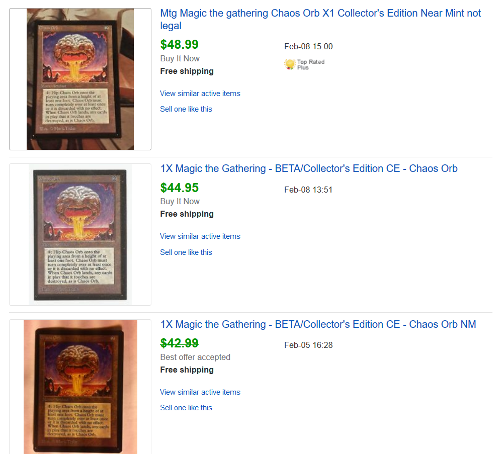 If only one recent completed listing isnât inspiring, then check out what shows up for Chaos Orb. (Disclaimer: one of these completed listings is a copy I purchased.)