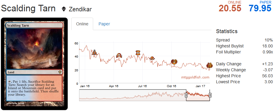 Modern is in a bear-market period with prices on multiple staples in a long-term decline. For an example of this, have a look at the chart of Scalding Tarn since the release of Oath of the Gatewatch (OGW). It's fallen from 55 tix all the way down to the 20-tix level in recent weeks.