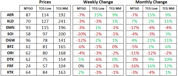 All MTGO set prices this week are taken from GoatBot's website, and all weekly changes are now calculated relative to GoatBot's "full set" prices from the previous week. All monthly changes are also relative to the previous month's prices, taken from GoatBot's website at that time. Occasionally, full set prices are not available, and so estimated set prices are used instead.