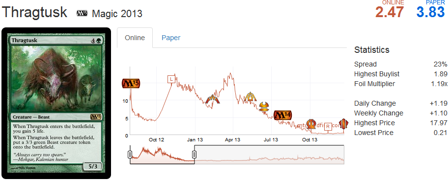 Just check out the price of former Standard staple Thragtusk in the spring of 2013 to see what I mean (see below). If you were a buyer around the release of Dragon's Maze, this card was about to enter a downtrend that lasted well into the Fall and rotation out of Standard.