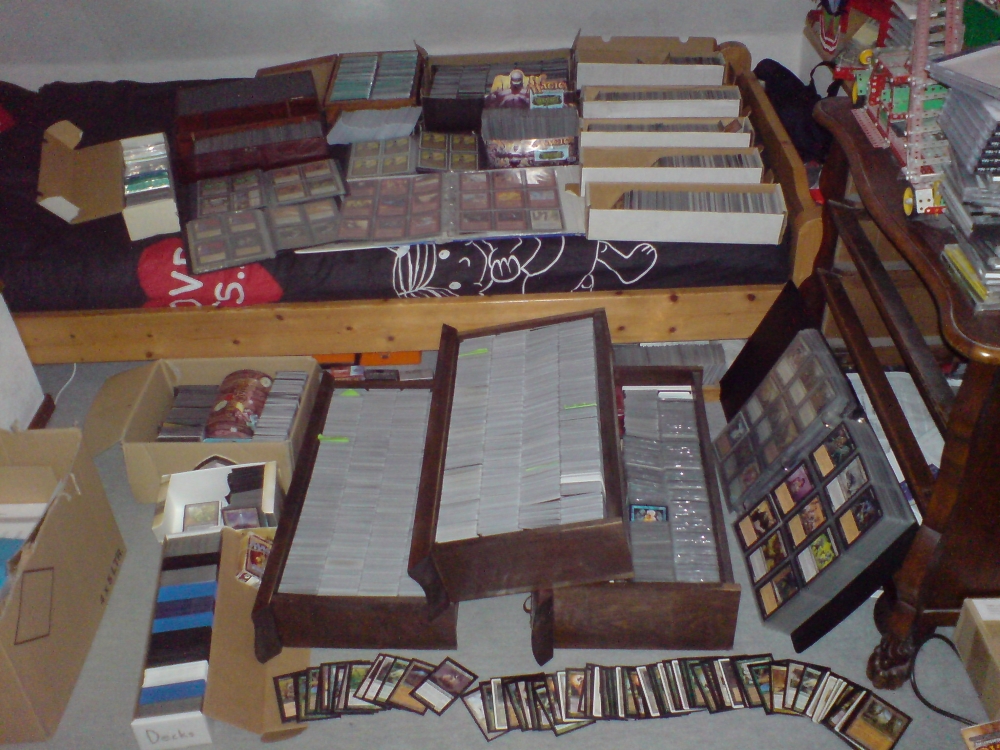 I own roughly 100k cards, down from about 200k half a year ago when I made a big trade, but still a huge amount for most. Of those 100k there are about 61k cards in my collection and the rest is a whole bunch of basic lands, trade stock, bulk, decks and other extra's. More than most online stores I know in The Netherlands and a better selection too. I can find any card in my main collection in under 20 seconds, a little more if it's in a deck or in one of a few special boxes.