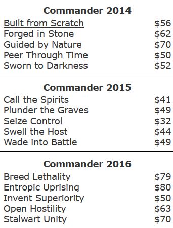 Other than that, I think the only way these decks will move in price is if: a) the headlining general increases in popularity, b) their contents increase in value, or c) they become naturally more expensive due to passing of time. This starts to get into the Commander metagame, which is beyond my areas of expertise – there are others in the MTG finance community who would be far more adept at predicting such trends. For me, I’ll stick to the numbers.