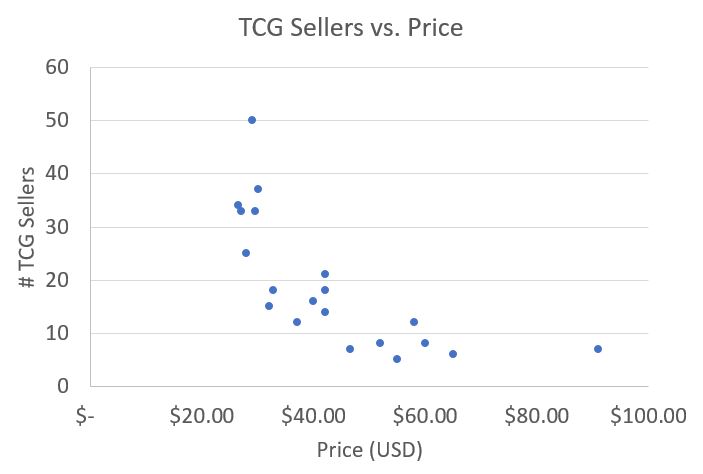 To start, I created a graph relating the number of TCGplayer sellers (should be roughly proportional to the amount in stock) against the TCG low price for each Commander deck dating back to 2013. (I left the first set of decks out due to their rarity from being the first ones printed). The result is a pretty compelling curve. I tried an exponential fit using Excel, but in reality the curve should be hyperbolic. There is an unofficial “minimum price” that sellers would be willing to sell a deck at, and there’s limitless price on the upside.