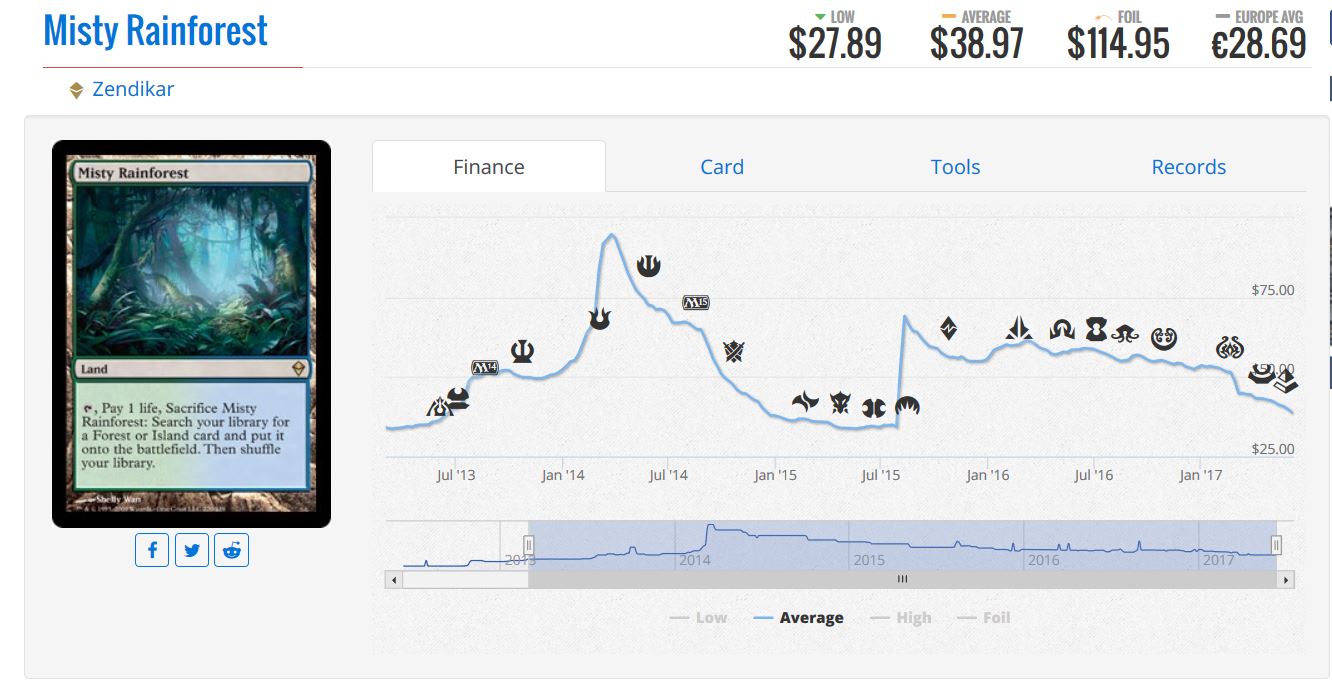 Meanwhile, there are over 60 copies of Misty Rainforest in stock at Star City Games across Zendikar and Modern Masters 2017 printings. I do think the Zen fetches will recover eventually, but I would prefer to park my funds in duals—even with the extremely low likelihood of another reprint so soon after the last one. This should come as no surprise to my regular readers.