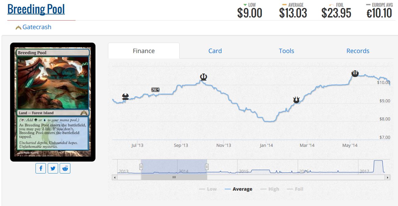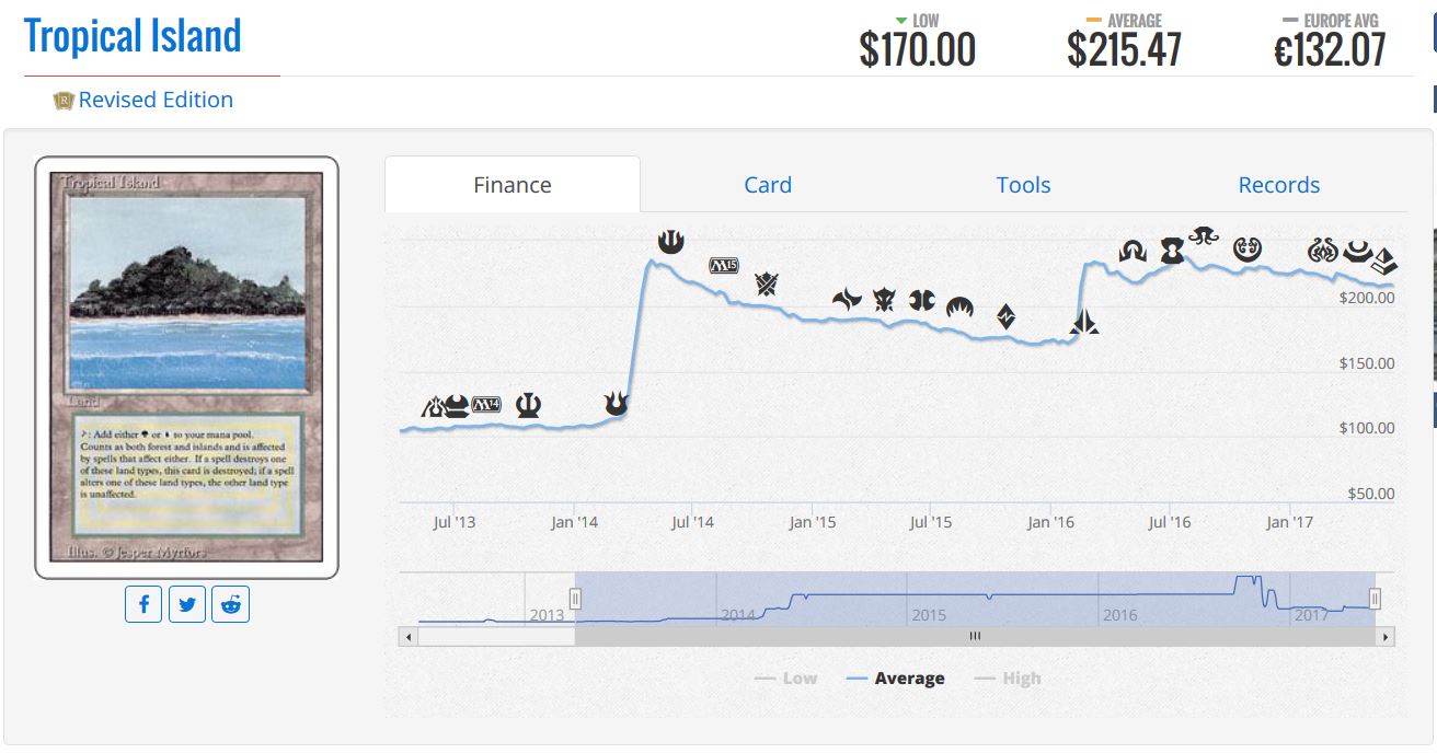 With this timeframe, Breeding Pool did gain the most! It would appear that in the middle of our case study, Tropical Island (along with most other relevant Reserved List cards) made a dramatic spike in price. But following that event, prices have done virtually nothing for three years. Thus when looking at the time range of June 2014 to June 2017, we see that Breeding Pool—which had no reprint—gradually grinded higher in price.