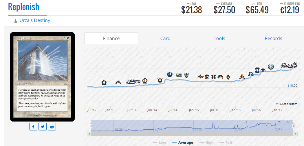 For this update, I'll be focusing on Replenish. A Reserved List card which has shown steady growth dating back to 2012. With the newly released card from Hour of Devastation: Solemnity, there seems to be renewed interest in this card. This was mentioned in discussions when the card was revealed on the Insider Discord, and stated as a card that players would likely eye after the initial hyped cards such as Glacial Chasm subsided somewhat. While Solemnity has attributed to renewed interest, we do have to take into account it's long-standing success in EDH/Commander.