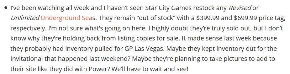So where do we go from here? Well for starters, the rest of the market is likely to follow Star City Games in pricing. I noticed after SCG bumped their buy price on Underground Sea to $300, Card Kingdom promptly jumped theirs from $235 to $285. I followed this one closely, but I imagine many other cards will follow suit.