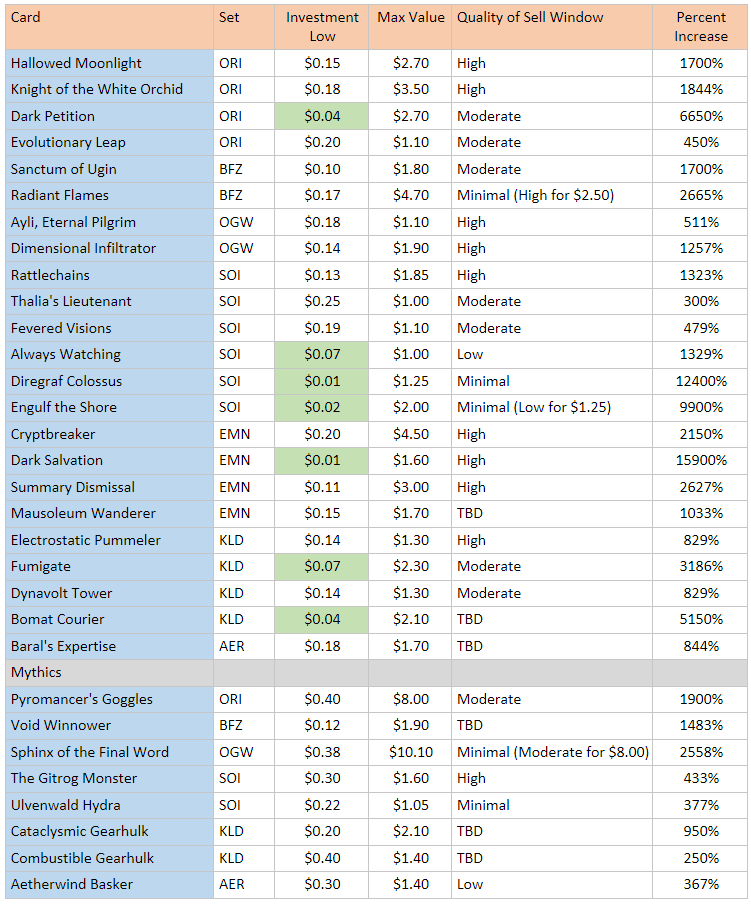 One thing that was surprising is that there were a lot more successful tiny-stock rares than I would have guessed. With the exception of Dragons of Tarkir, there were actually at least a few from every set. The returns on all of the ones without a "minimal" sell-window rating would have been very good, and additionally some of these, like Knight of the White Orchid or Radiant Flames, would have been incredible investments.