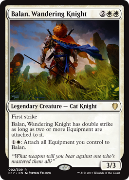 Finally, I think some players will grab new commanders and use them for other strategies entirely. Mirri, Weatherlight Duelist could make for a great GW Control deck. Also, Balan, Wandering Knight and Nazahn, Revered Bladesmith seem designed for equipment decks (but different styles from one another).