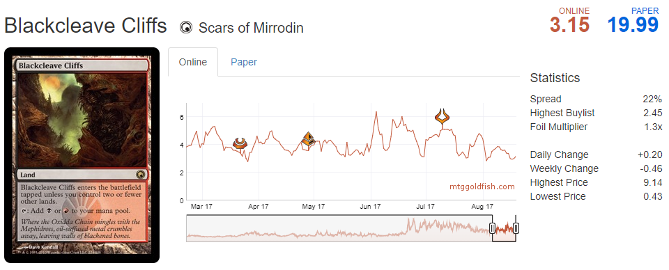 The main thing I want to illustrate here is that lands are some of the best investments on MTGO. Blackcleave Cliffs and Raging Ravine are staples in Modern Jund and have been for a long time. Currently the demand for these two cards is extremely low, so I suggest you get a couple playsets of each to be prepared for Jund's inevitable resurfacing in the format.