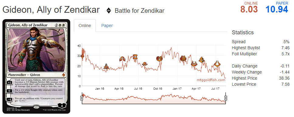Hi Adrian, nice article but I have to disagree with your final point. When you are buying an asset that is declining in price, it’s commonly referred to as ‘averaging down’ in IRL finance. Although it can be appealing psychologically, I think it’s a mistake to try this out. You could have been averaging down on Gideon since Aether Revolt was released, buying the dips and looking for a price target that always turned out to be out of reach. If you had pursued this strategy, you would have ended up turning a small loss into a big one.