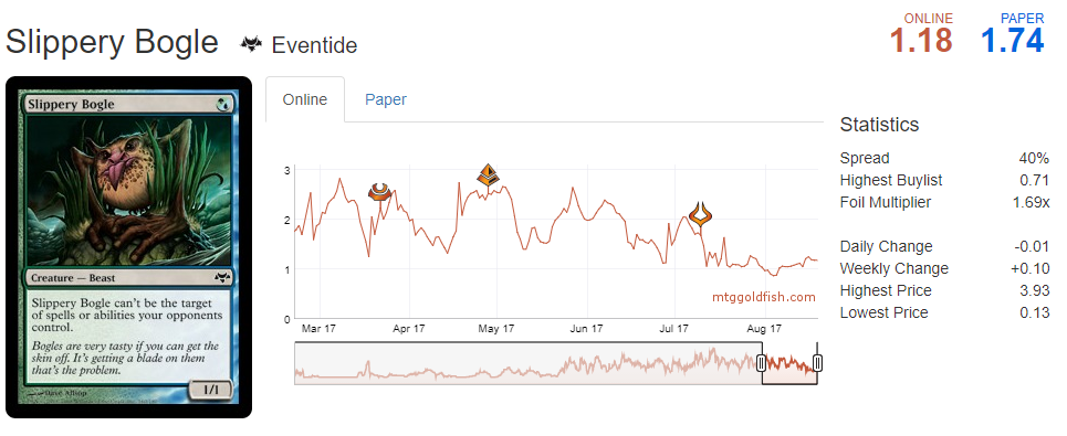 These are the main creatures in Modern Green-White Hexproof Auras, and both are currently at their respective low points. These cards tend to go up in price when G/W Auras is good in the metagame, and occasionally, the Bogles will increase in price due to the Pauper format. This deck will be good when there are a bunch of midrange decks running around in the field, as spot removal is totally useless against it. I think Kor Spiritdancer will take a longer time than Bogles to grow in value, but both of them will definitely earn us some tickets one day.