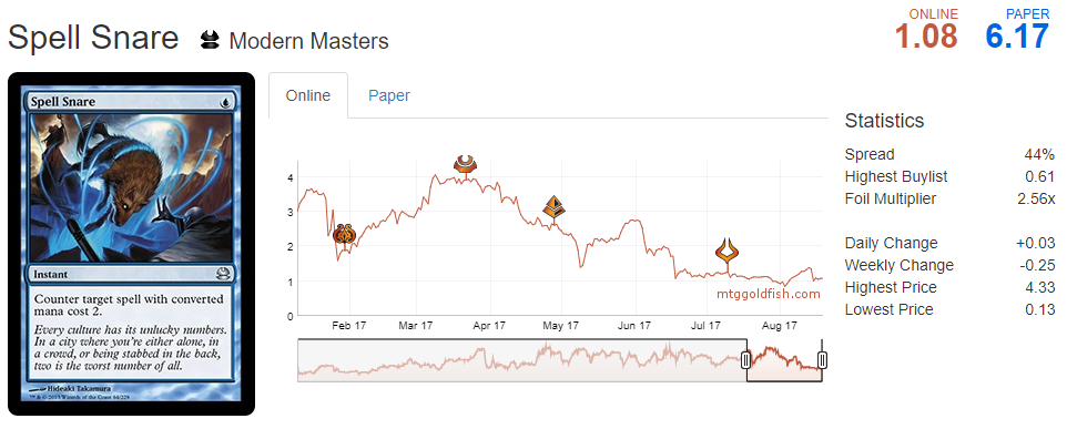 Spell Snare became less popular since mid-June of this year, probably because Death's Shadow took over Tarmogoyf's place as the best creature in the format. However, I think this is not permanent, as Modern is a very huge format where any card can be good. When the metagame is full of two-drops again, it will be the time for Spell Snare to shine.