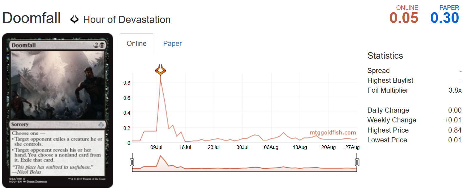 Unlike the above cards, Doomfall has a more hazy future. A printing of a two-mana spell like Transgress the Mind would significantly weaken its prospects. But the fact that it exiles means that it can proactively answer the Hour of Devastation Gods that other answers struggle to remove permanently, and the added utility of an edict effect helps justify a CMC of three. I'm willing to bet that this will have a role as an effective sideboard card, in which case Doomfall should see price spikes to 0.30 to 0.50 tix during its Standard lifetime. A worthy speculation I'm hoping to add to my portfolio in the coming days and weeks. (EDIT: I've now bought 62 of them for 0.007 tix a pop)