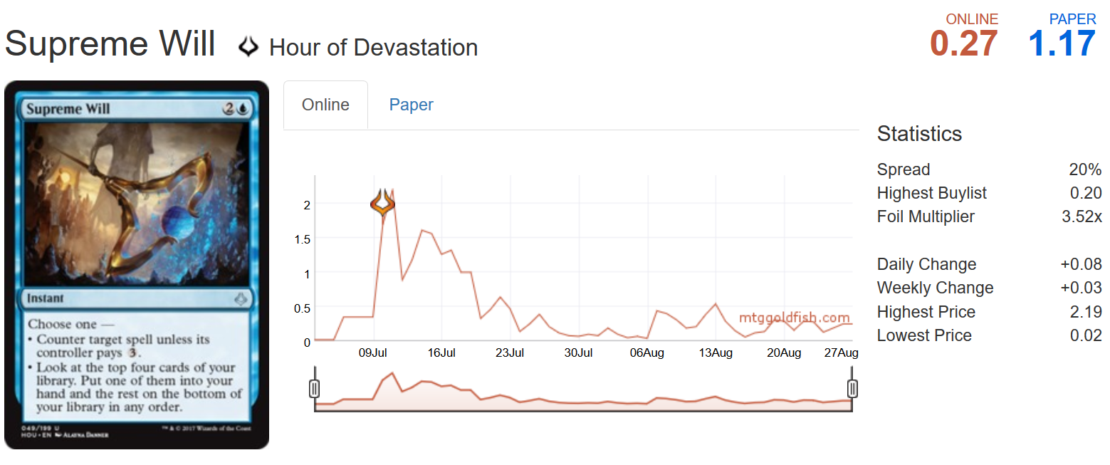 As my mother once told me, always eat breakfast, and always set your price alerts early. From August 4 to August 6, Supreme Will was selling between 0.02 and 0.05 tix. That would have been a wonderful time to invest. Supreme Will is a versatile and powerful card that should see significant play in any blue-based control deck. I don't like buying at the current price of 0.26 tix, but if it gets into the low teens, I'll likely take the plunge. Remember that uncommons from small sets tend to have larger sell windows than those from large sets, so Supreme Will is definitely a tiny-stock spec target for those of you who don't micromanage your portfolio.