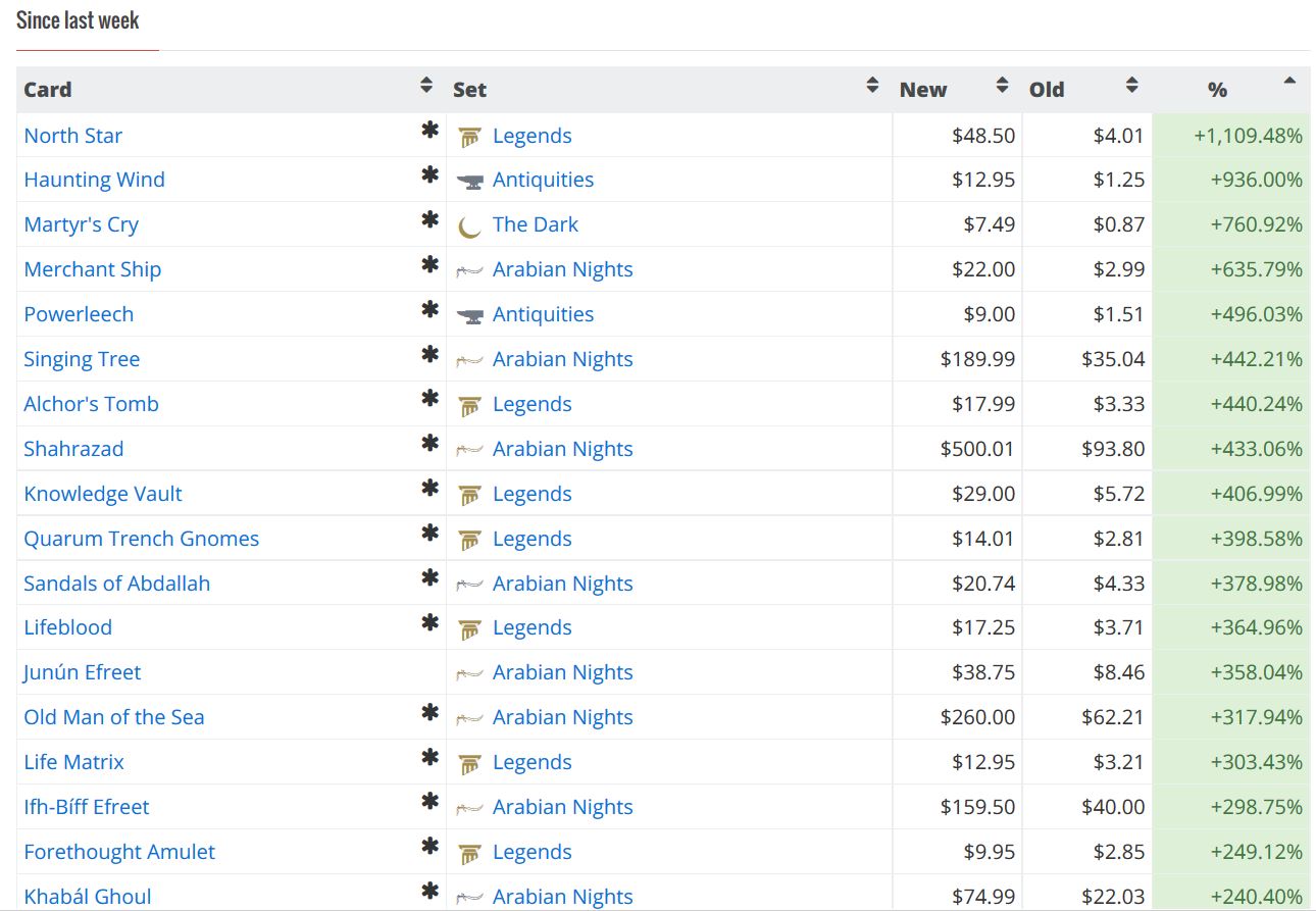 In all I count 62 Reserved List cards (not counting Alpha, Beta, or Unlimited movers) that increased by at least 5% over the past week. That doesn’t include all the Arabian Nights and Legends stuff that jumped despite not being on the Reserved List.