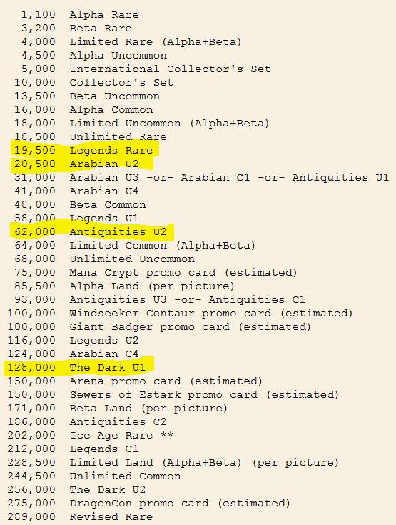 Still, we can see just how sparse they are: just 19,500 Legends rares and 20,500 Arabian Nights “rares” (U2s). Antiquities “rares” (U1s) are also fairly sparse, with 62,000 printed. Over time many of these cards were likely torn, damaged, thrown out, and flat-out lost to society, making the actual available quantities on the market far less.