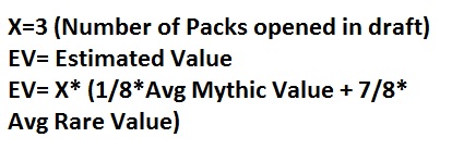 Thanks for the awesome feedback. I’m always happy to adjust my methodology if there is a better option available. I definitely agree that the equation is very “dumbed down” (i.e. there are likely far more accurate ways to calculate the desired number, which in this case was the “value” associated with opening 3 packs for draft), that being said it’s main value was in showing the difference between having a higher average rare value plays in this instance. I would definitely love more feedback from a statistician though so please PM me if you’re willing to let me pick your brain some.