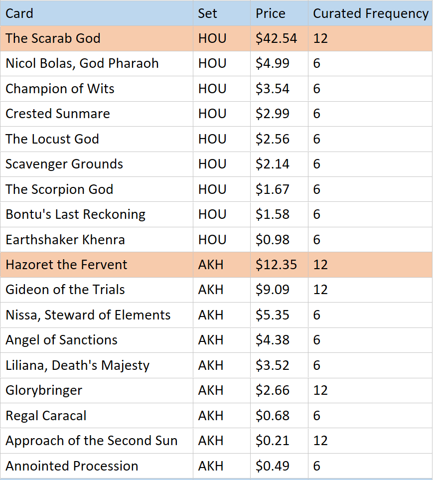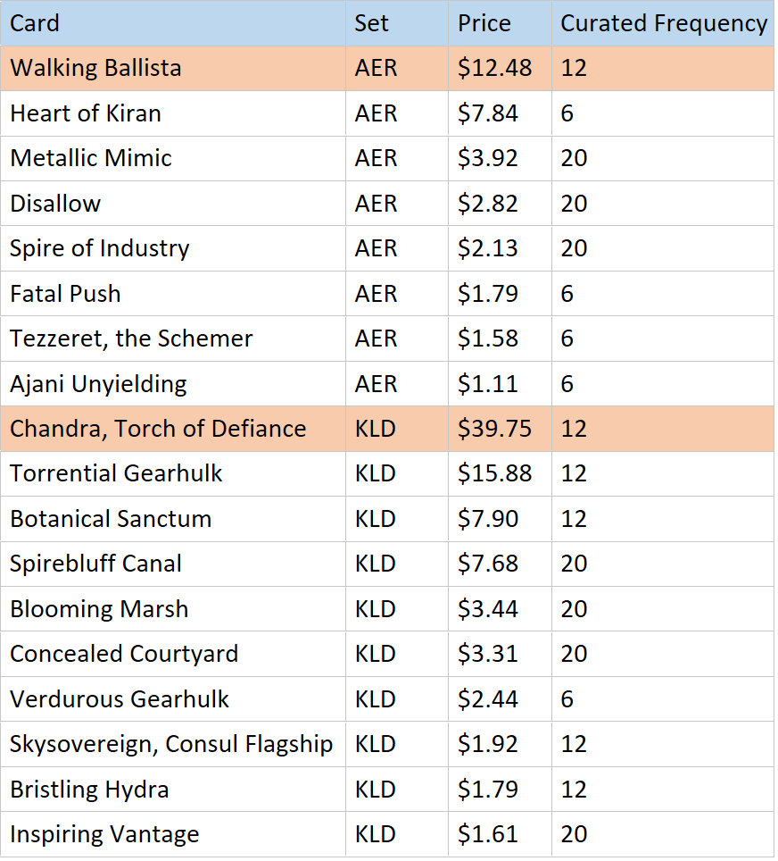 I think what stands out from this data is how standardized it is. We are getting a clear model from Hour of Devastation and Ixalan for how we can expect the curated frequencies to work moving forward – 12 for cards over $5.00 and 6 for the others. There are some oddities in the frequencies of the prior Standard sets (Glorybringer and Approach of the Second Sun with frequencies of 12), but I think the reason for the higher frequencies of Kaladesh block cards is that Wizards is trying to play catch up with them, to get their supplies up to where they would have been had they been in treasure chests for the entire duration of their Standard life.