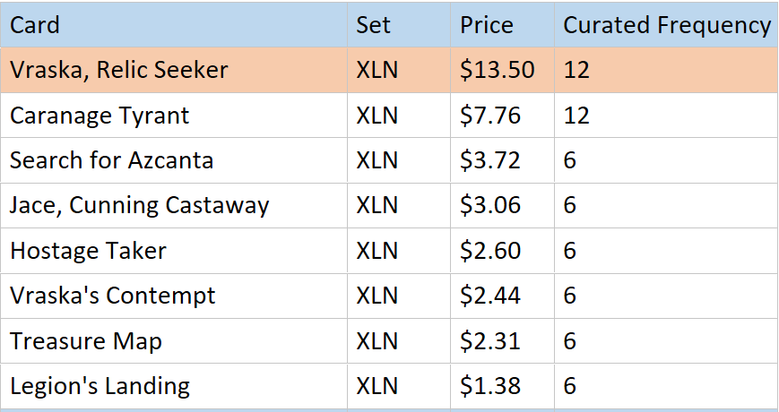 These three cards in particular were not added to the list despite cheaper cards like Legion's Landing and Treasure Map being added to the list. It is possible that Lee Sharpe had already determined which cards would be on the list prior to Ixalan's release (which would be a vote of confidence in favor of all those cards). It is also possible that the pool of Ixalan cards and their curated frequencies were determined more recently and with an awareness of what Standard might look like after the release of Rivals of Ixalan (which, again, would be a vote of confidence in favor of all these cards).