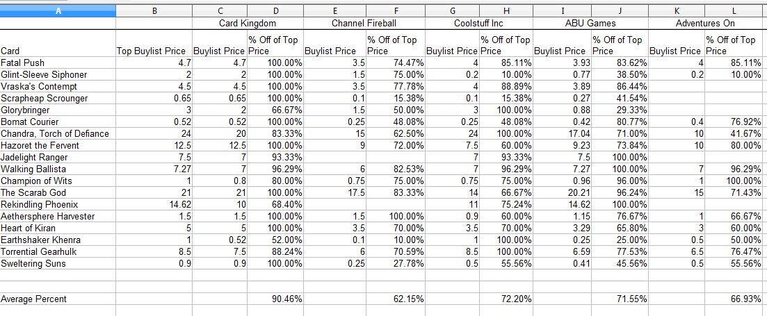 It's honestly quite surprising that Channel Fireball's Pauper buylist prices are so poor, given their decision to host Pauper events at GPs has caused the surge in demand and prices. It is possible that they had planned on doing this for a while and simply stocked up before announcing it (which would have been a very wise financial decision).This one is interesting. It's possible that some stores simply haven't adjusted their buylists to support the Pauper format just yet (or perhaps they don't want to), but the difference between average buylist percents is the largest of any format reviewed. Though it is important to note that the store that caused this huge spread (Adventures On) wasn't buying much Pauper stuff at all, and they weren't paying much for the cards they were buying, which does imply that they aren't really wanting to invest in the format at this time (which is their prerogative).