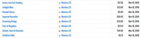 If you’re hoping to buy some cards for your decks, I recommend waiting. If you’re grabbing the Masters 25 printings then you probably only have to wait another week or two. Prioritize cards played frequently in Modern and hold off on some of the lesser-played stuff a bit longer.
