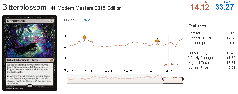 The reason is very simple: decks that plays Jace and Bloodbraid are slow midrange decks that are good in the mid to late game, and Bitterblossom provides an incremental advantage that can easily be great against slow strategies. Furthermore, as I mentioned previous week, these Faerie tokens are a good way to beat midrange/control decks because those decks rely on spot removal to deal with threats.