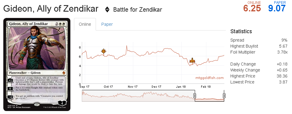 Gideon increased by only a little from 5.88 tickets. However I've seen some black-white and blue-white decks playing Gideon, Ally of Zendikar in their 75 and it makes their deck pretty hard to beat. Here's an example posted online: