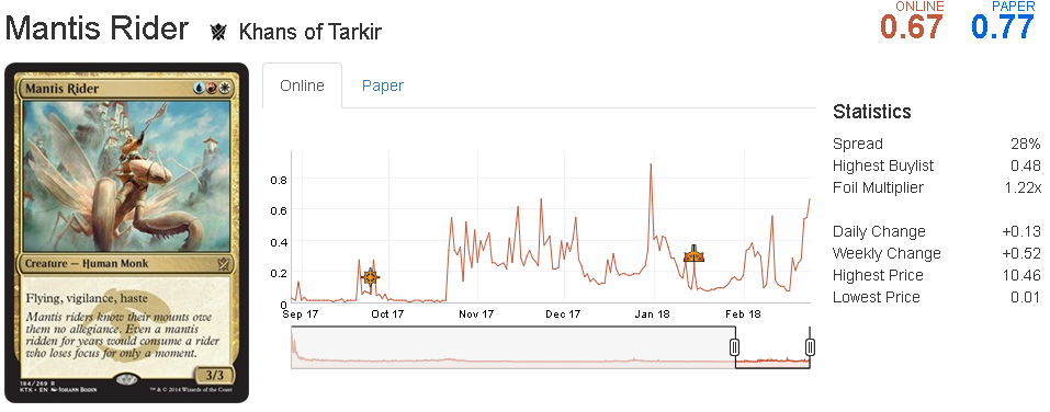 Mantis Rider is already part of the 5-Color Humans deck, and now with Bloodbraid fresh off the banlist Tribal Zoo gets a double-boost by including both Bloodbraid and Mantis. If this version of Tribal Zoo gets popularized, I wouldn't be surprised if Mantis Rider increased to 2 tickets per piece. Thus, I suggest buying some playsets for investment.