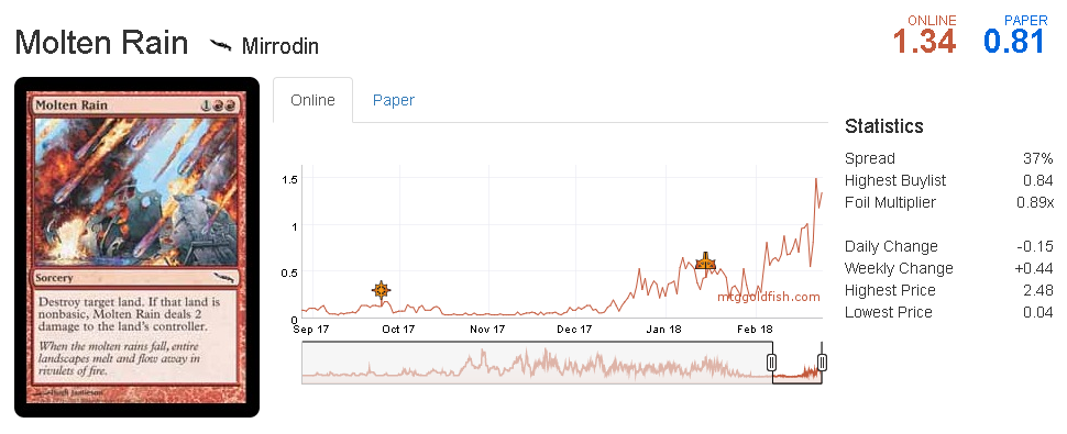 Molten Rain increased in price recently thanks to the Bloodbraid unban. Players are playing this card online in RG Ponza together with Bloodbraid. In addition the aforementioned Tribal Zoo has this card in the sideboard, which makes gains more likely.