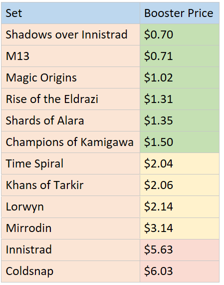 Because we know which formats are more popular and more likely to be chosen for the flashback treatment, we can look at those sets' booster prices and determine which ones are worth investing in. This is a strategy to employ with excess tickets, as you won't know in advance when you can sell out. But given that we've been told that there will be more flashback drafts going forward, chances are good you won't be caught holding onto these investments for more than a year.
