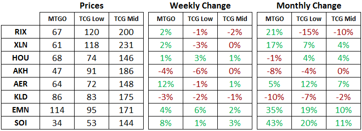 All MTGO set prices this week are taken from GoatBot's website, and all weekly changes are now calculated relative to GoatBot's "full set" prices from the previous week. All monthly changes are also relative to the previous month's prices, taken from GoatBot's website at that time. Occasionally, full set prices are not available, and so estimated set prices are used instead. Although Hour of Devastation (HOU), Amonkhet (AKH), Aether Revolt (AER), and Kaladesh (KLD) are no longer available for redemption, their prices will continue to be tracked while they are in Standard.