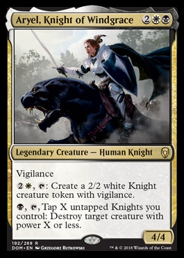 Aryel is the "Knight commander" we've been waiting for. While we actually have a fair number of legendary Knights in Magic's history, it isn't until Ixalan block that we got any black-white combinations. The Ixalan block options are also Vampires and have cool abilities, but none of them actually care about the Knight creature type in any meaningful way.