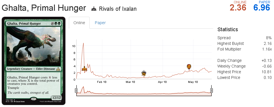 The price hasn't gone very high because online players always pick the best deck to play. If you look at paper prices, however, it has reached the 20-ticket mark, but it's still 10 tickets on MTGO. At mythic rare, the supply is low enough that when and if the card shows a sign of making Top 8 during the first two days of the PT, there's a high chance that it will start increasing in price online.