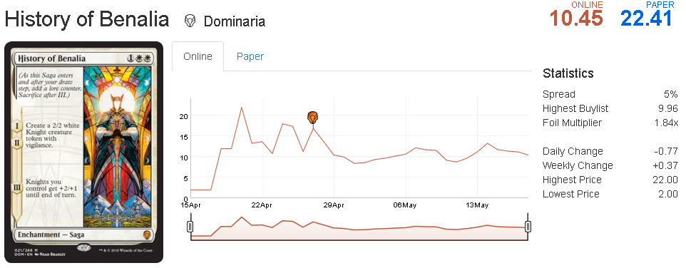History of Benalia is one of the highest-rated mythics in Dominaria. At 1WW, the ability to create 2/2 tokens and pump them after two turns is pretty strong on its own. I think this card is currently underplayed, and I'm expecting some kind of white aggro deck to come out to compete with RB Aggro.