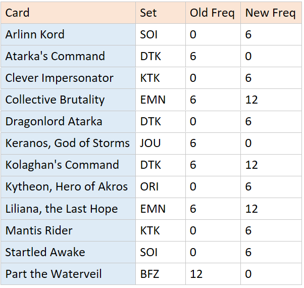 These are the two cards on the list you probably care most about. These were introduced to the chests in January, and now their frequencies are being increased from the slight 6 to the moderate 12. Collective Brutality has fallen off a cliff in recent weeks, and Liliana's outrageous price is being corrected, from 50 tix down to the present 40 tix.