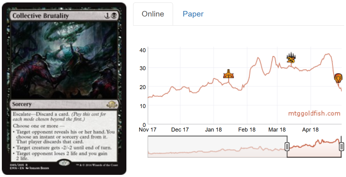 Kolaghan's Command is having its frequency doubled, and currently is sitting at a relative low of 15.80 tix. I'd be a bit hesitant to be a speculator (though, with a ceiling of about 30.00 tix, there's definitely room to make money here), but I do think now is the appropriate time to buy the one or two copies you need for your Modern deck. At minimum, the same holds true for Collective Brutality.