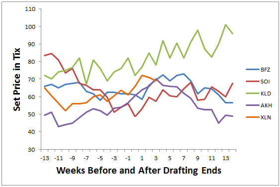 Checking in on the price graph for sets when they are no longer being drafted can give another clue to trying time a sale. XLN reached a peak in the mid-70-tix range two weeks ago, but it is right on track when compared to Amonkhet (AKH) and Battle for Zendikar (BFZ). Back in early April, I predicted it would hit a price range of 70 to 80 tix and this looks to have been accurate.