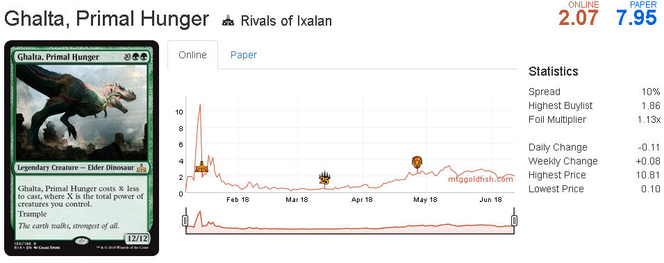 Ghalta, Primal Hunger was described as something similar to Metalwork Colossus. Previously I said the Dinosaur version of the Colossus was slightly better because the deck plays a bunch of big creatures at cheap costs. However, I didn't realize that creatures are easier to deal with compared to artifacts.