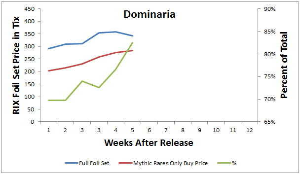 The foil mythic rare strategy has worked very well for DAR. Prices have been rising since the set was released and value has been flowing to foil mythic rares. The tricky part of employing the strategy this time around was the fact that prices for singles were high relative to foil mythic rares from past sets. Those who gritted their teeth and plunked down their tix have been rewarded handsomely. For the portfolio, on paper returns are on the order of 80 tix per set or forty percent.
