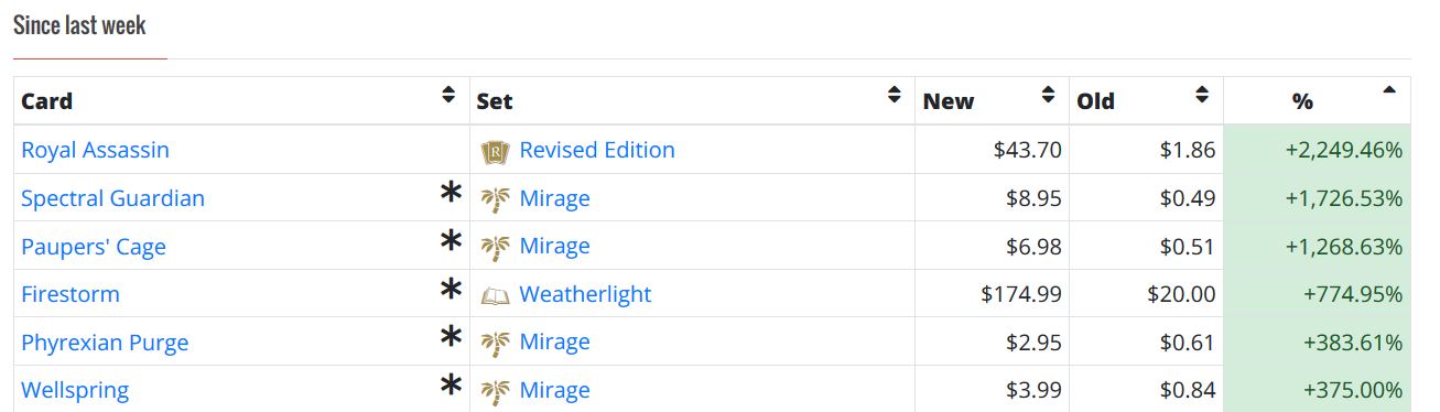 First, Mirage Reserved List cards are on the move. This is evidenced by the recent spikes on MTG Stocks.