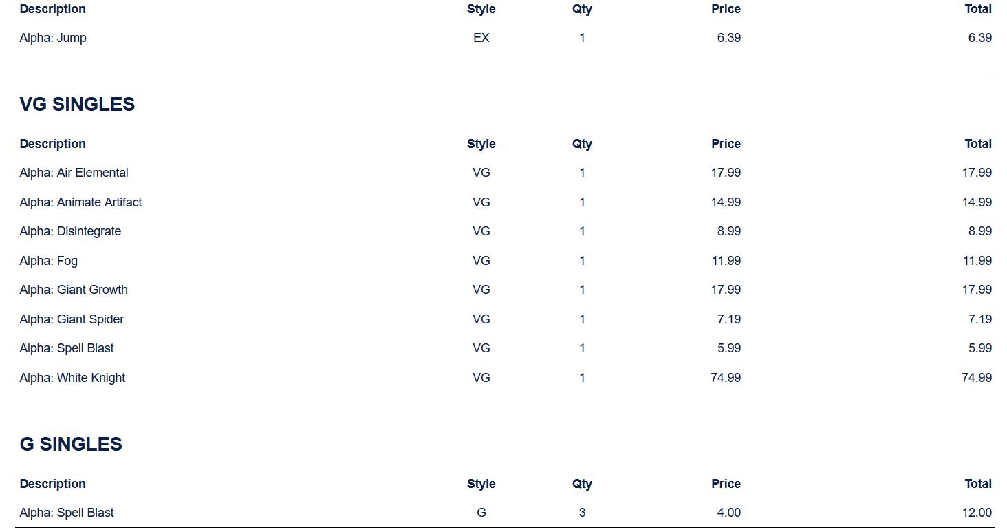 Back in March I discovered a major pricing discrepancy in Alpha cards. Prices had surged higher, but some vendors were slow to adjust. This led to numerous arbitrage-driven purchases from vendors such as Cool Stuff Inc, Star City Games, and my personal favorite, Card Kingdom. Here’s an example purchase: