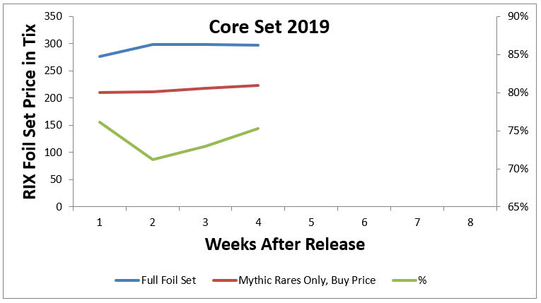Two things we can see in the chart is that the percentage peaked at over eighty percent and that the price of a foil set saw substantial appreciation going from under 300 tix to over 350 tix in the first month of its release. For speculations, the first point is crucial to timing the sale of foil mythic rares in order to maximize profit. If RIX and XLN are also included, we'd see that the percentage peaked at eighty-three and seventy-seven respectively. So, for M19 we have a pretty good idea that sometime in the second month of release, if the foil mythic rare buy price over the foil set price hits about eighty percent, then we should be ready to sell.