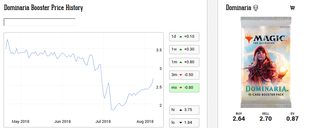 For the rest of the month, the interest in DAR draft will remain high. It's regarded as one of the finest sets for Draft in recent memory, so it's a very compelling alternative to the core set for many players. Once we get into September, though, Cube draft will restart along with previews from Guilds of Ravnica (GRN). This will reduce the interest in tired draft formats and prices of DAR and M19 boosters will both head lower as a result. This means that the next month is the prime window for selling DAR boosters while the next big buying opportunity for boosters won't arrive until the end of September when GRN is released, pushing M19 into the draft queues and removing DAR draft. Have some tix ready to buy M19 boosters at that time to capture some solid gains from a cyclical and predictable trade.