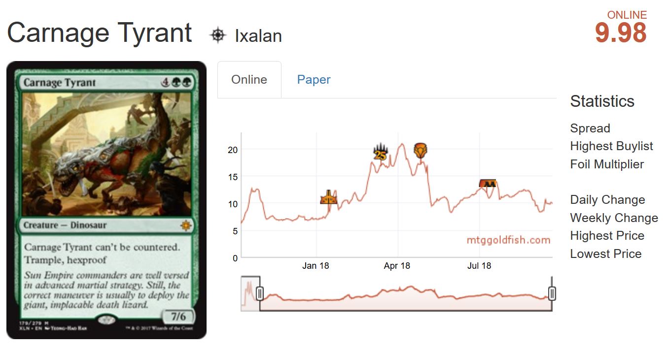 Financial Outlook: Buy Now. A high of 20 tix is likely, with the possibility to reach 25 tix. Teferi-anchored UW Control decks would have to become virtually irrelevant for Carnage Tyrant to dip in price, and that strikes me as highly unlikely. Carnage Tyrant's price is low enough right now to invest in; if you plan to run green in Standard, I think you should pick up your playset now.
