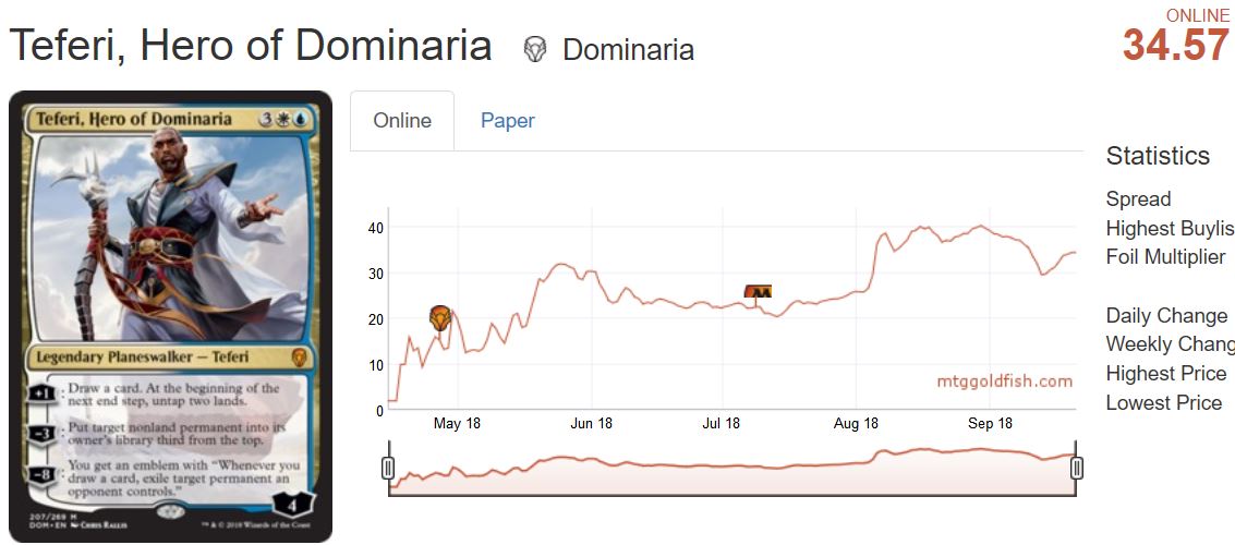Financial Outlook: Buy Now. Teferi will be a 40- to 50-tix card in the future. If that seems high, remember that both Modern and Standard have significant demand on MTGO. We're definitely past the point where investing in Teferi is a smart play, but those looking to play Standard over the next year should go ahead and bite the bullet now, lest they have to pay more in the future.